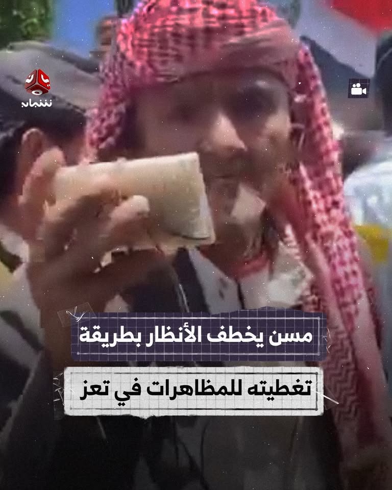 “مشط” لفّ عليه سماعة موصولة بأذنه.. مسنٌ يمني يخطف الأنظار بطريقته الطريفة في تغطية لمظاهرة في مدينة تعز أمس الاثنين.