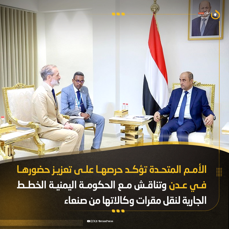 جاء ذلك خلال لقاء جمعه برئيس الحكومة اليمنية المعترف بها، “سالم صالح بن بريك”، لمناقشة الخطط الجارية لنقل بقية مقرات مكاتب منظمات ووكالات الأمم المتحدة إلى عدن، إضافة إلى فرص التحول من مرحلة التدخلات الإغاثية الطارئة إلى الدعم الإنمائي الأكثر استدامة، ودعم خطة التعافي الاقتصادي.