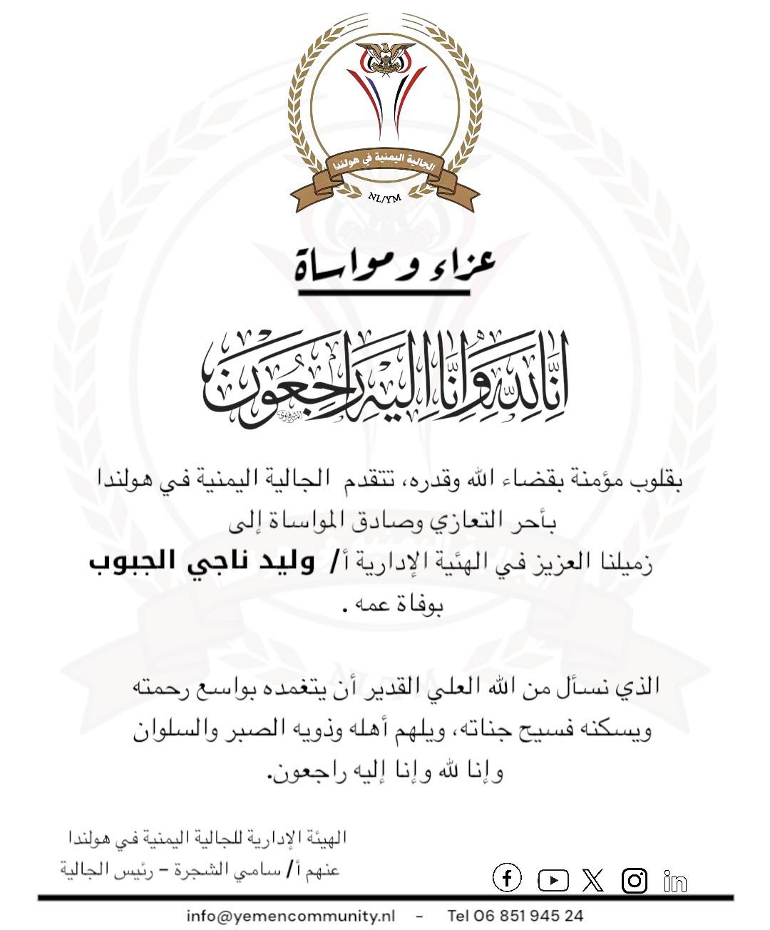 بقلوب مؤمنة بقضاء الله وقدره، تتقدم الجالية اليمنية في هولندا بأحر التعازي وصادق المواساة إلى