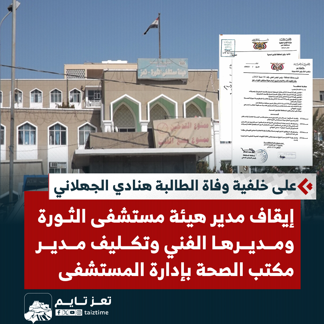 إيقاف الدكتور عبدالرحيم السامعي مدير هيئة مستشفى الثورة والدكتور احمد قحطان المدير الفني لحين استكمال التحقيقات في وفاة #الطالبة_هنادي_الجهلاني