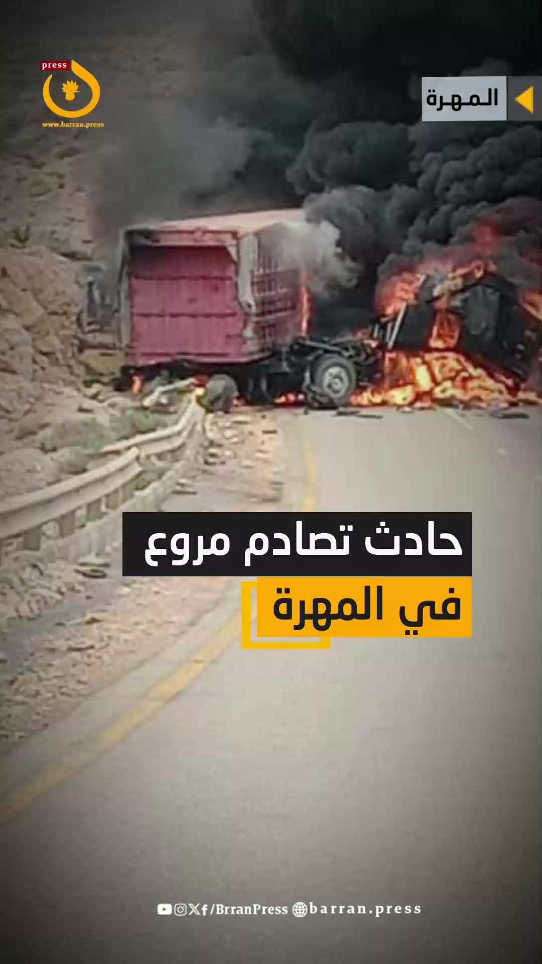 حادث مأساوي في المهرة: تصادم عنيف بين ناقلتين يؤدي إلى اشتعال النيران ووفاة مواط…
