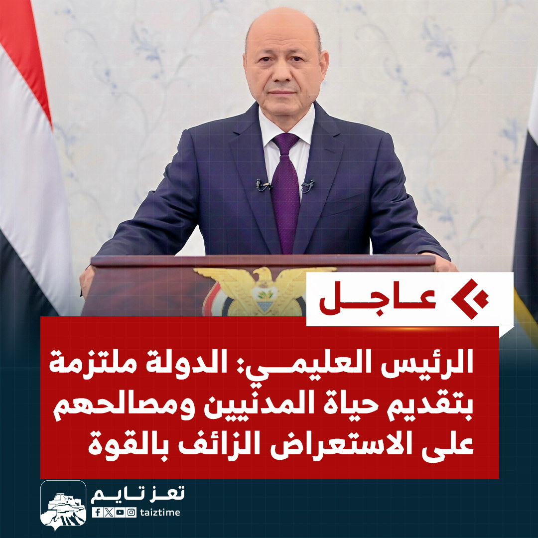 #عاجل| الرئيس رشاد العليمي في خطاب للشعب: الدولة ملتزمة بتقديم حياة المدنيين ومص…