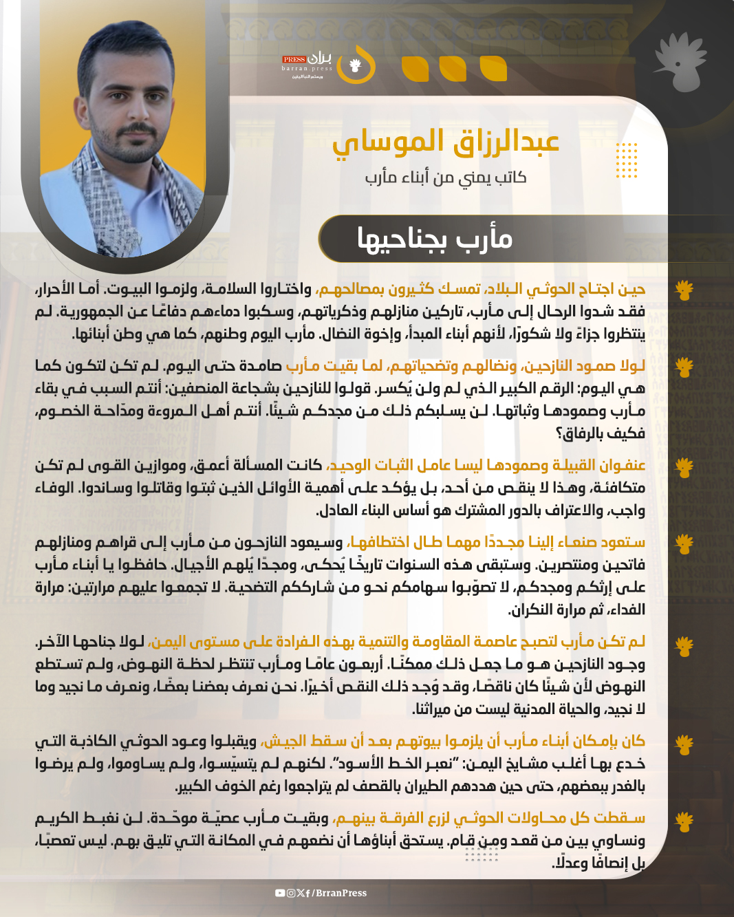 ستعود صنعاء إلينا مجددًا مهما طال اختطافها، وسيعود النازحون من مأرب إلى قراهم ومنازلهم فاتحين ومنتصرين. وستبقى هذه السنوات تاريخًا يُحكى، ومجدًا يُلهم الأجيال. حافظوا يا أبناء مأرب على إرثكم ومجدكم، لا تصوّبوا سهامكم نحو من شارككم التضحية. لا تجمعوا عليهم مرارتين: مرارة الفداء، ثم مرارة النكران. فمن قدّم روحه لا يليق أن يُقابل بالتجاهل، ومن صبر في زمن الخوف لا يستحق إلا الثناء والإنصاف والاعتراف.