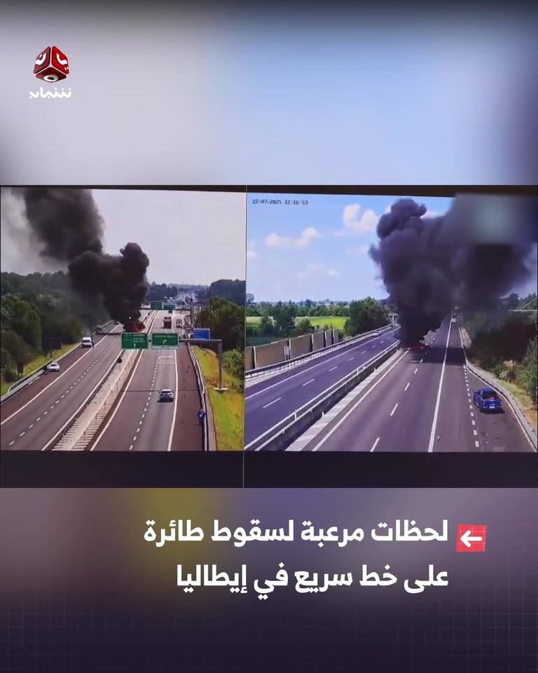 فيديو يظهر حادثة سقوط طائرة خفيفة بشكل مفاجئ وانفجارها على طريق سريع في إيطاليا،…