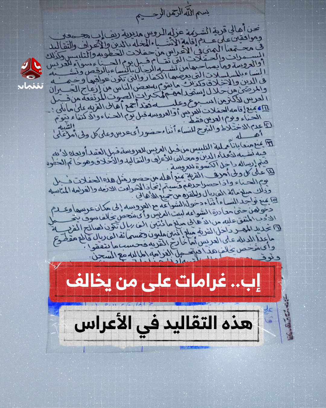 وثيقة متداولة صادرة عن أهالي قرية الشرزة في محافظة إب، تتضمن تحديد شروط خاصة لإقامة الأعراس وتقييد بعض العادات المتبعة فيها، إضافة إلى وضع ضوابط للمهور وفرض غرامات على المخالفين.